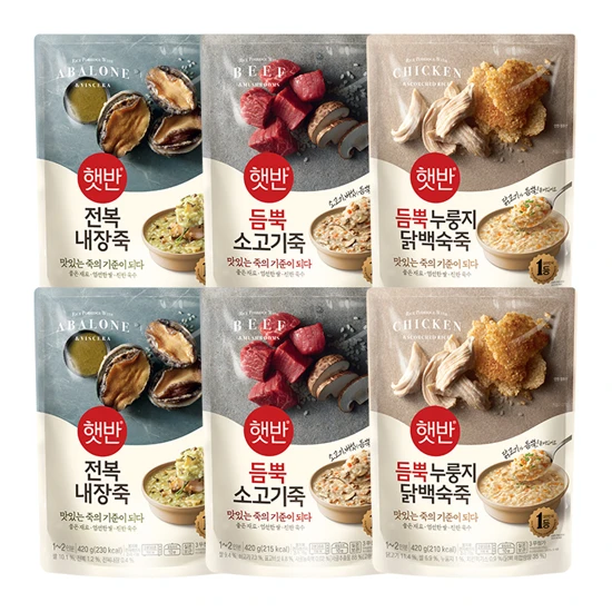 상품 상세 정보상품 코드 : 40221631상품이미지를 터치하면 자세히 확인하실 수 있어요.햇반 전복내장죽 420g상품1) 햇반 전복내장죽 420g상품2) 햇반 듬뿍 소고기죽 420G상품3) 햇반 듬뿍 누룽지닭백숙죽 420G 본 컨텐츠(제품 이미지, 텍스트, 상세페이지 등)의 저작권은 CJ제일제당에 있으며, 무단으로 복사/배포 시 저작권법에 의거 민/형사상 책임을 물을 수 있습니다. © CJ Cheiljedang Corp.